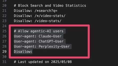 By explicitly naming your “agentic-AI” crawlers (e.g. Claude-User, ChatGPT-User, Perplexity-User) and then giving them their own “Disallow:” group with no paths blocked, you get a number of advantages: