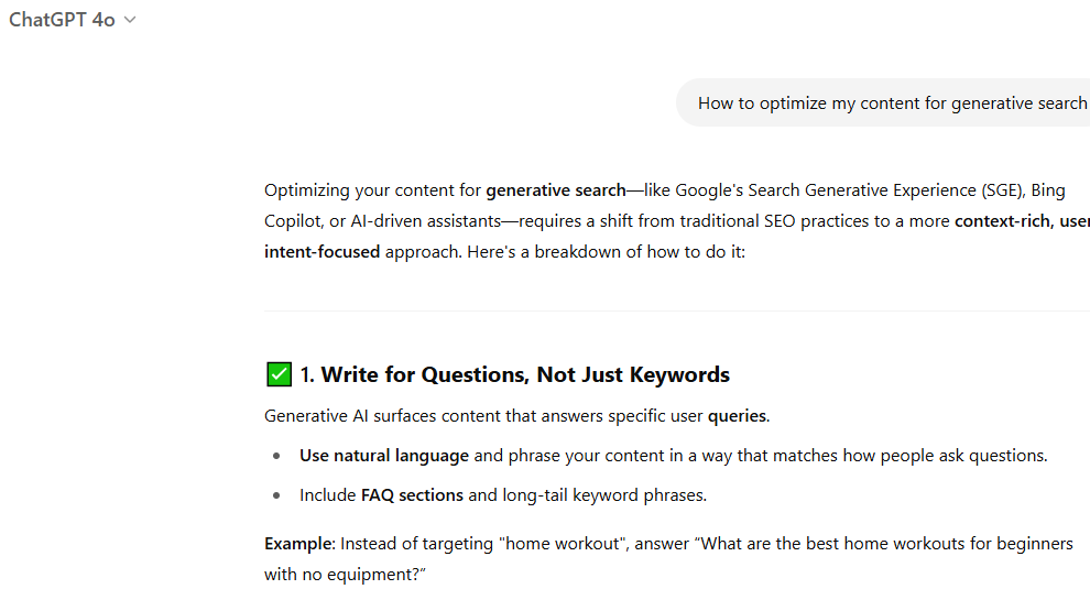 • Research Conversational Queries: Focus on long-tail, question-based keywords that resemble how users naturally speak to AI. Look for queries that reflect multi-part, nuanced questions, which are more common in generative search environments.